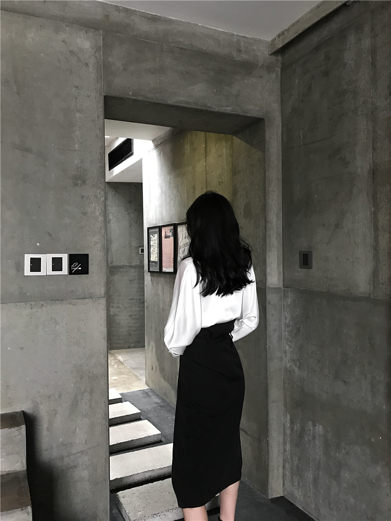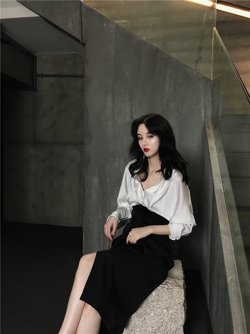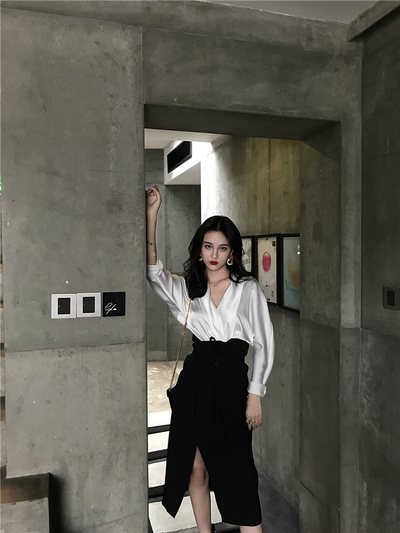 / 新款性感大v領襯衣復古OL風中長款高腰開叉半身裙兩件套時尚套裝