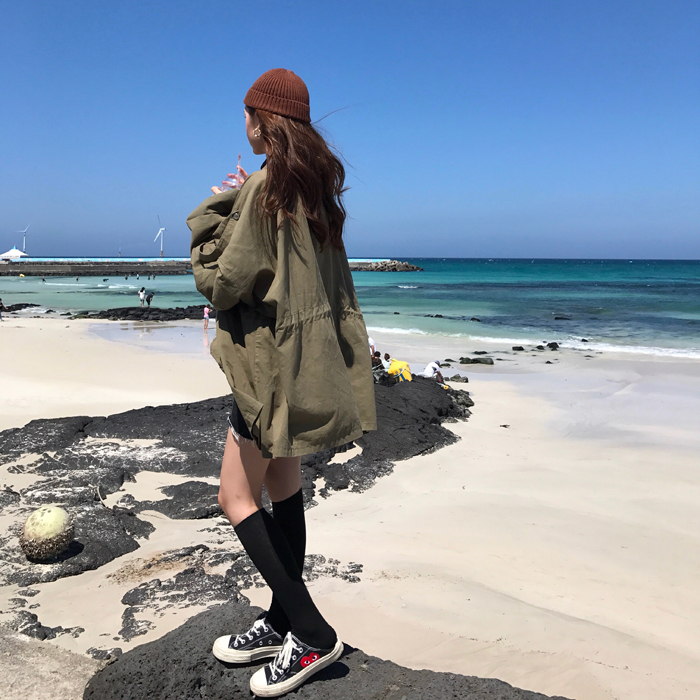 復古韓國oversize寬松蝙蝠袖拉鏈排扣口袋抽繩收腰工裝風衣外套女