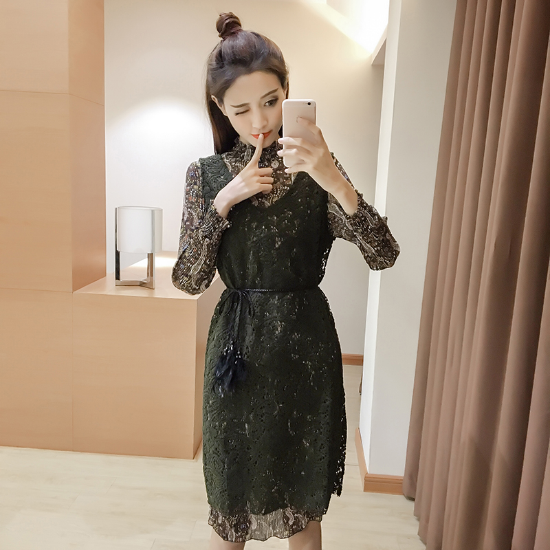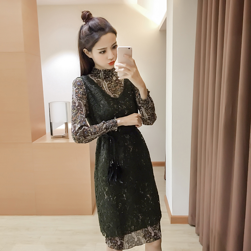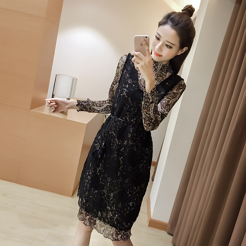 / 新款女裝蕾絲背帶裙兩件套女中長款顯瘦復古碎花長袖連衣裙春