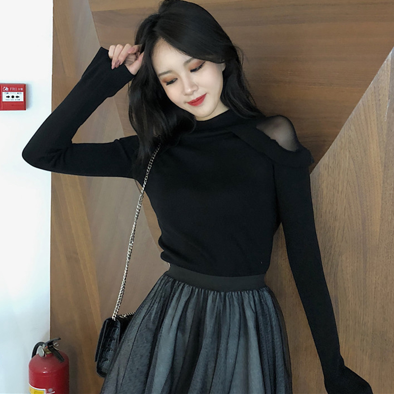 / 半高領露肩網紗拼接針織衫女秋冬裝新款修身短款黑色長袖打底上衣