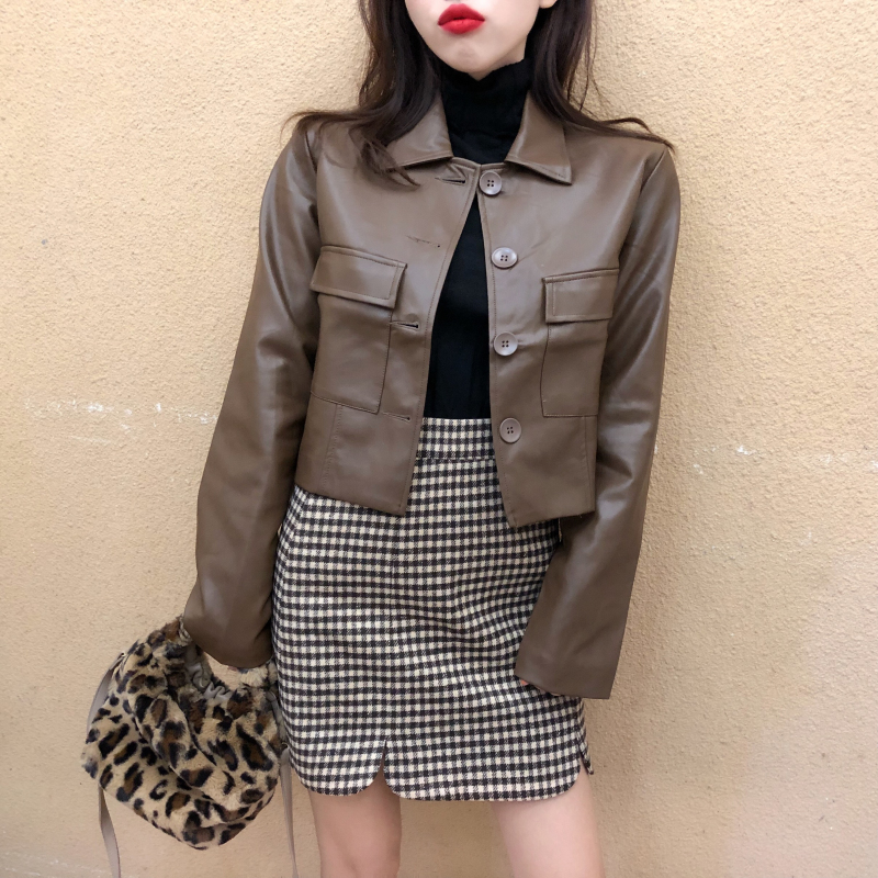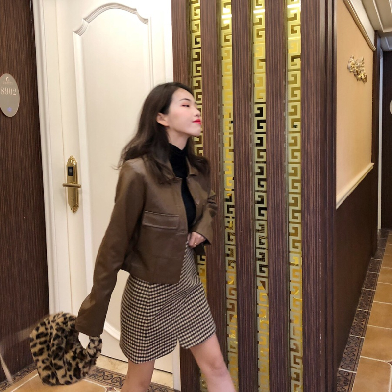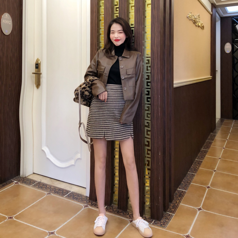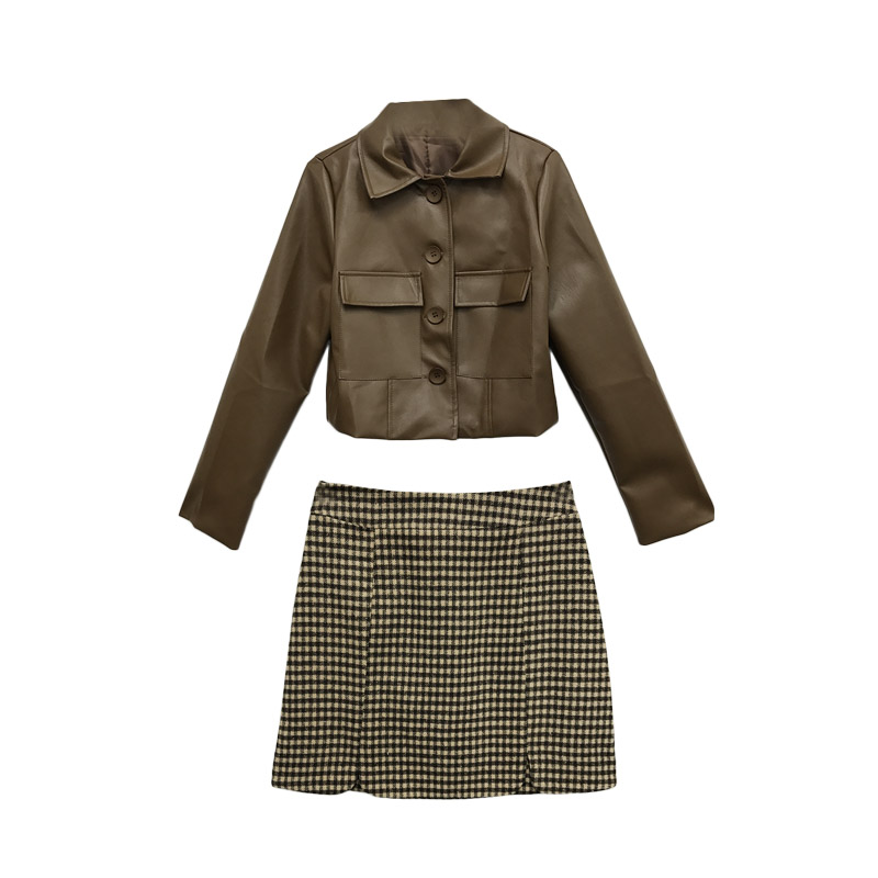 Color/顏色:棕色皮衣 格子半身裙