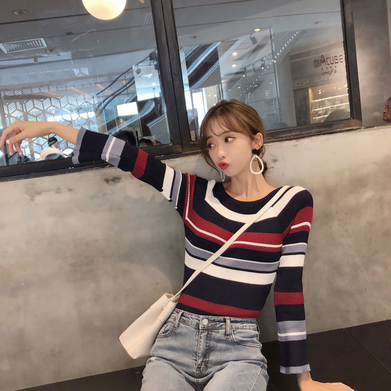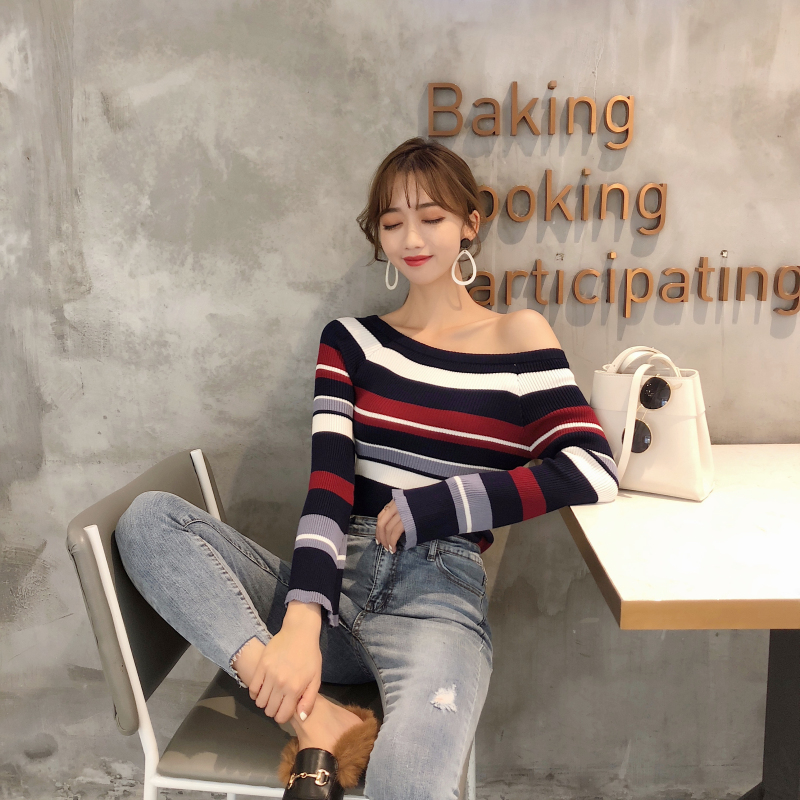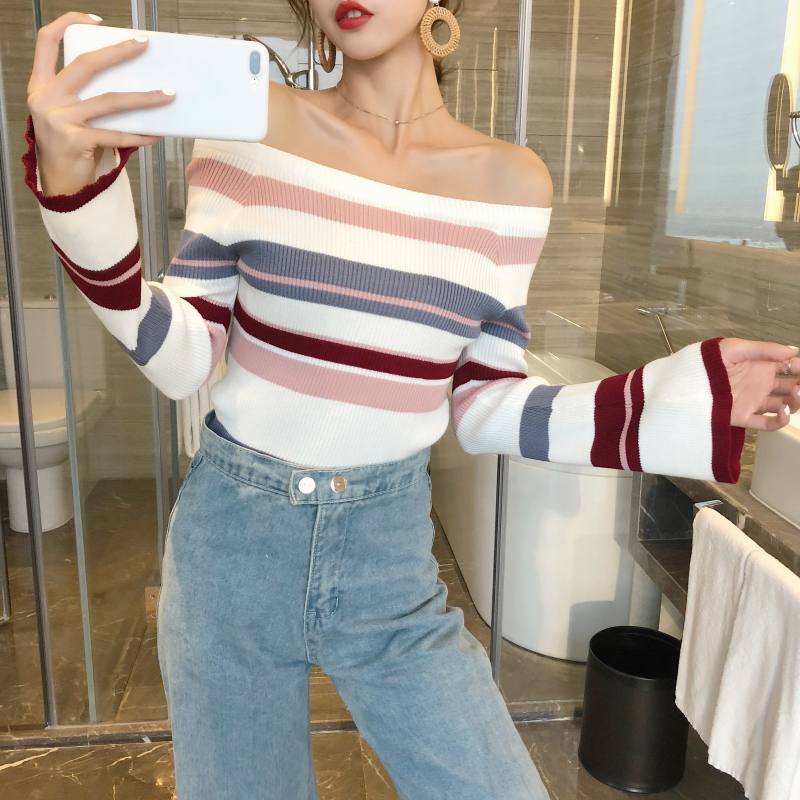 2018秋季港風時尚新款修身一字領露肩兩穿喇叭袖百搭針織衫女上衣