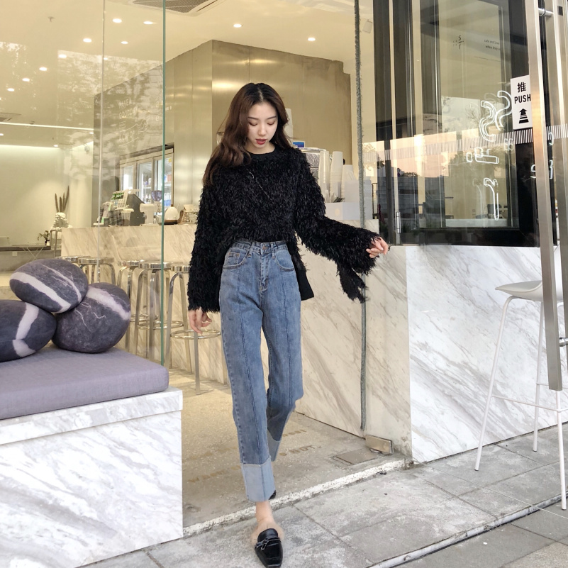 / 2018冬季新款韓版流蘇毛毛長袖寬松圓領百搭喇叭袖純色T恤女上衣