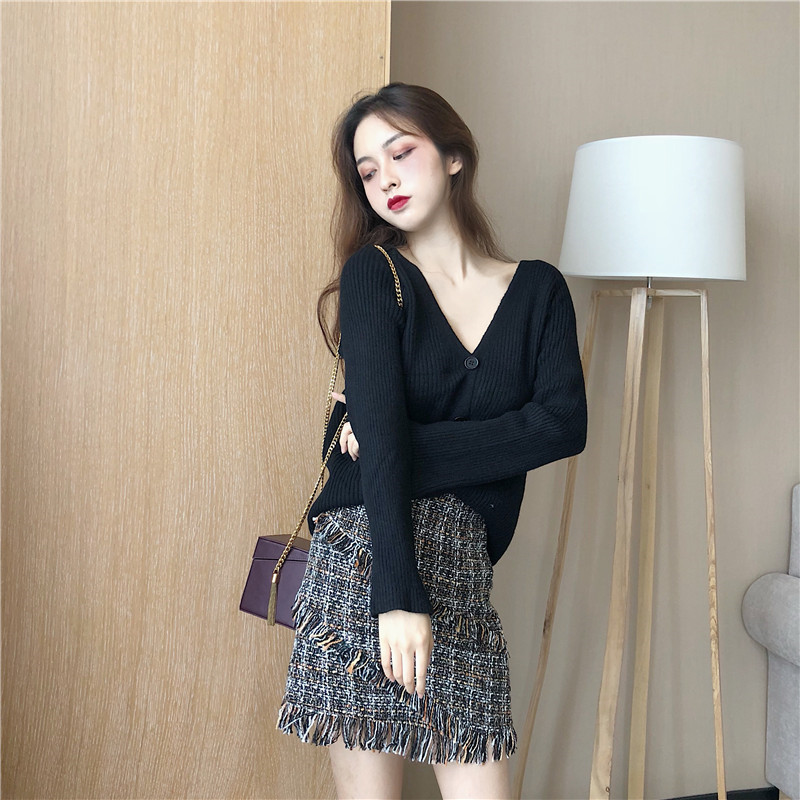 女神套裝秋裝2018新款V領喇叭袖毛衣針織開衫+粗呢高腰a字半身裙