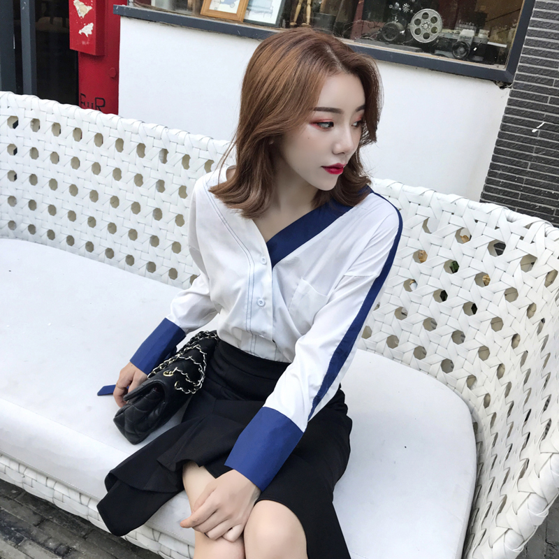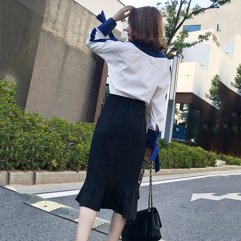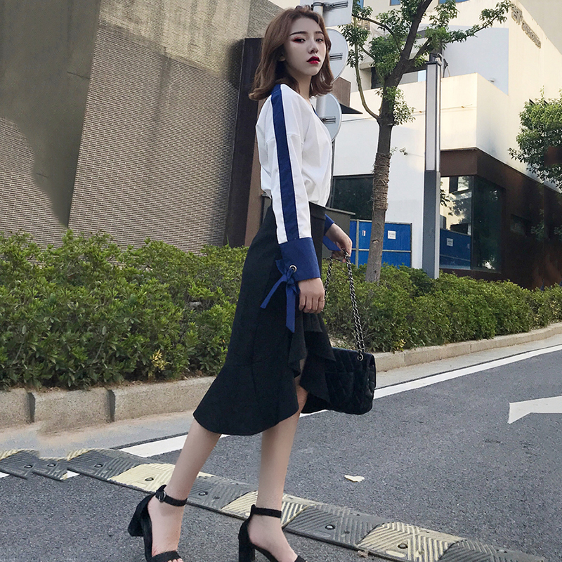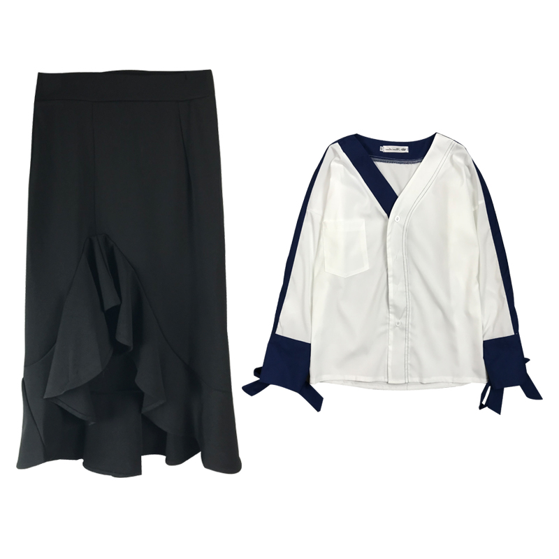 / 早秋新款氣質撞色V領雪紡襯衫高腰荷葉魚尾裙不規則半身裙兩件套