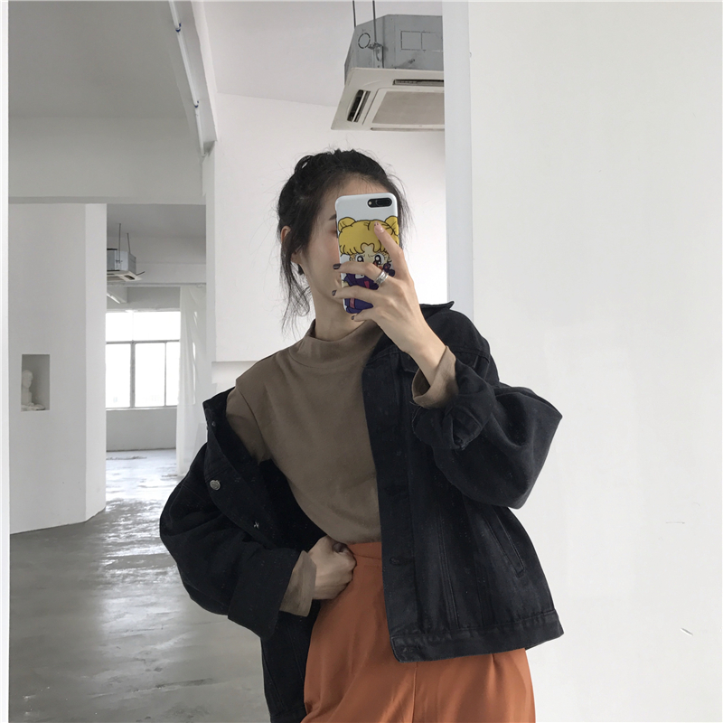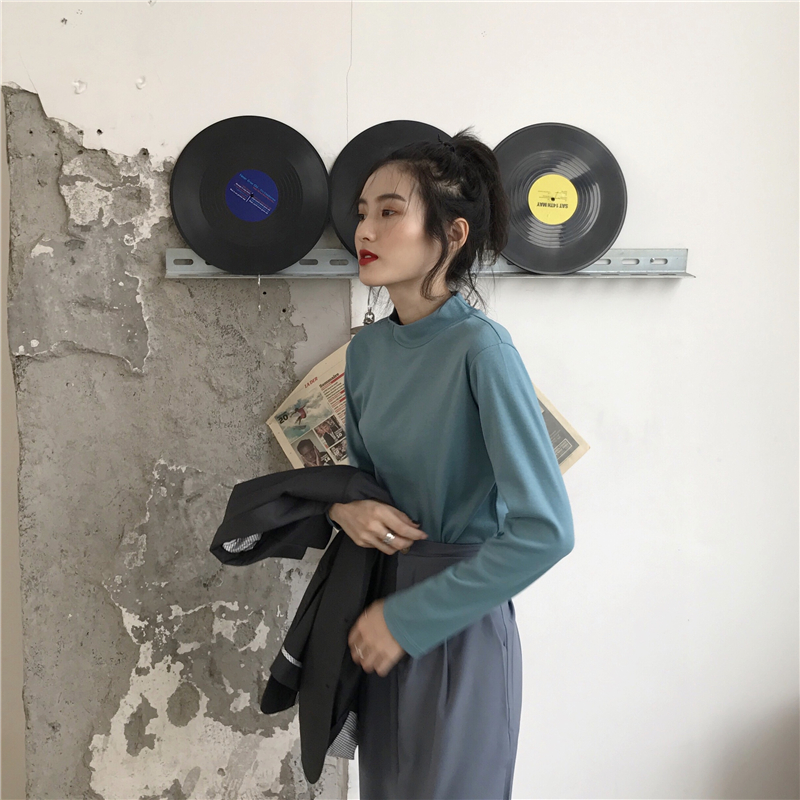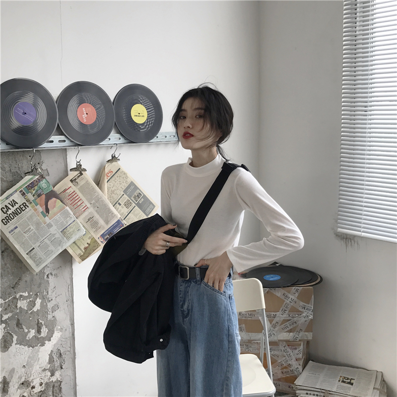 早秋上衣女慵懶長袖t袖女基礎款純色修身半高領加絨保暖打底衫Tee