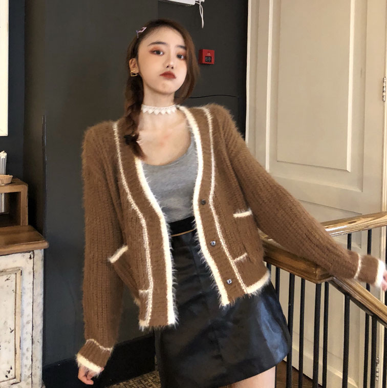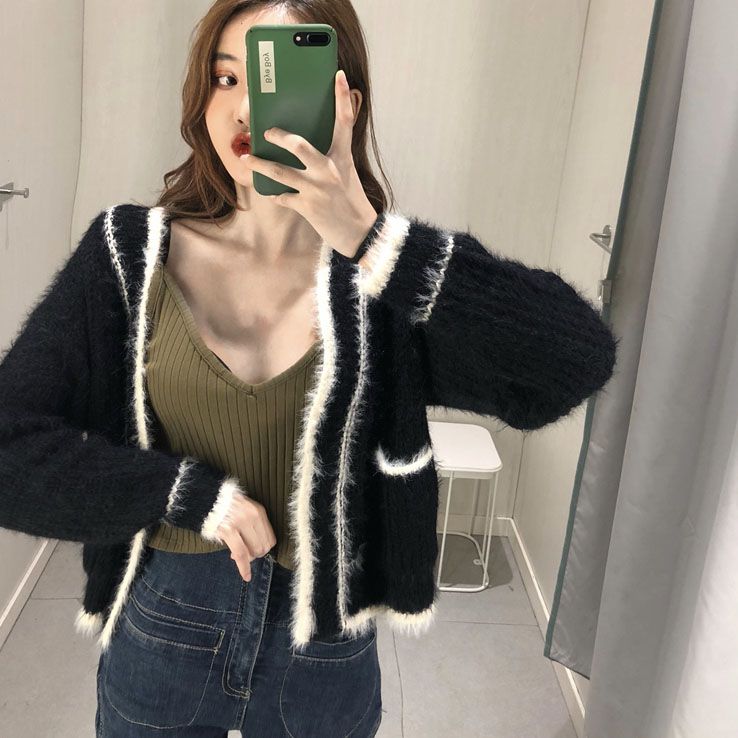 慵懶風套頭毛衣女2018新款秋冬小香風毛絨拼色V領針織衫開衫外套