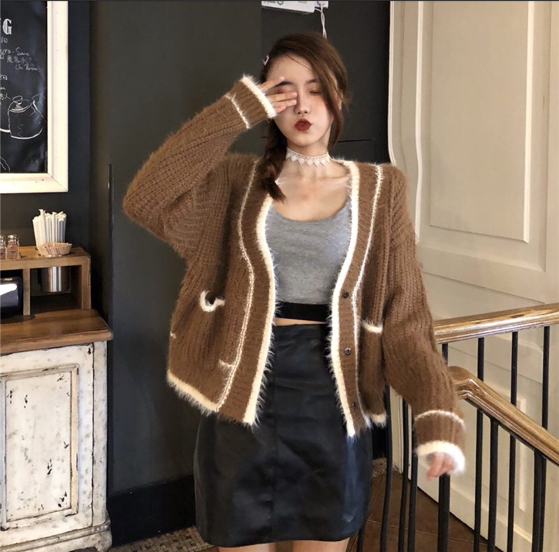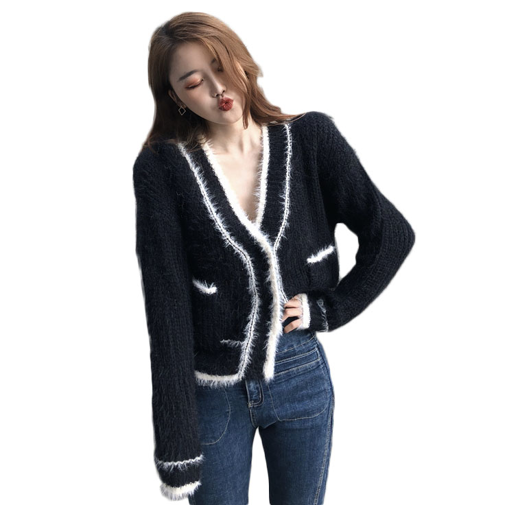 / 慵懶風套頭毛衣女2018新款秋冬小香風毛絨拼色V領針織衫開衫外套