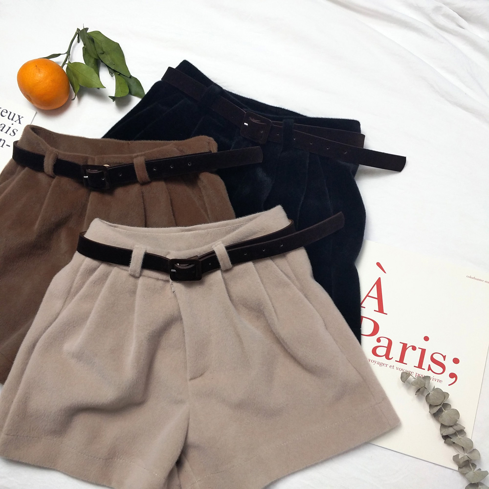 港味復古新款chic時尚秋冬百搭毛絨闊褲腿高腰裙褲短褲女潮送腰帶