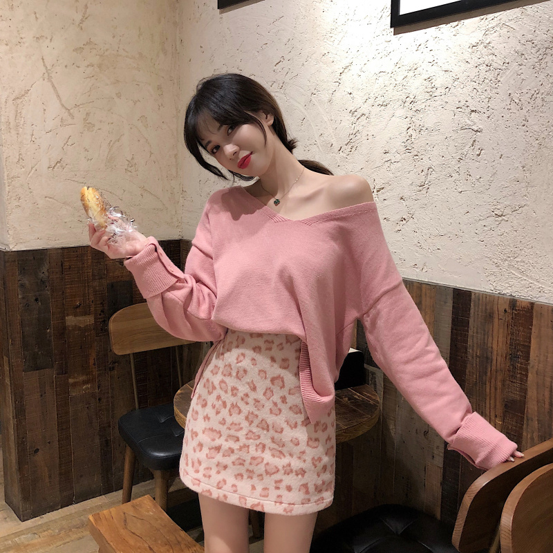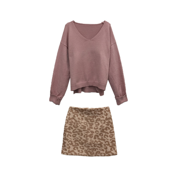 / 韓版秋裝女2018新款V領卷袖針織衫寬松側開叉毛衣+呢子A字豹紋裙