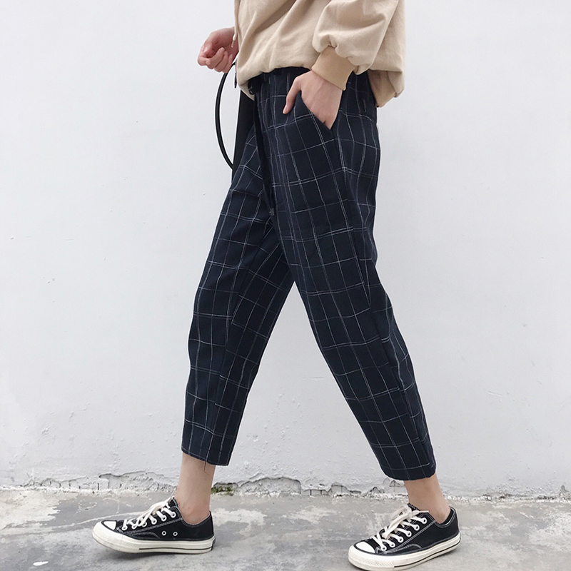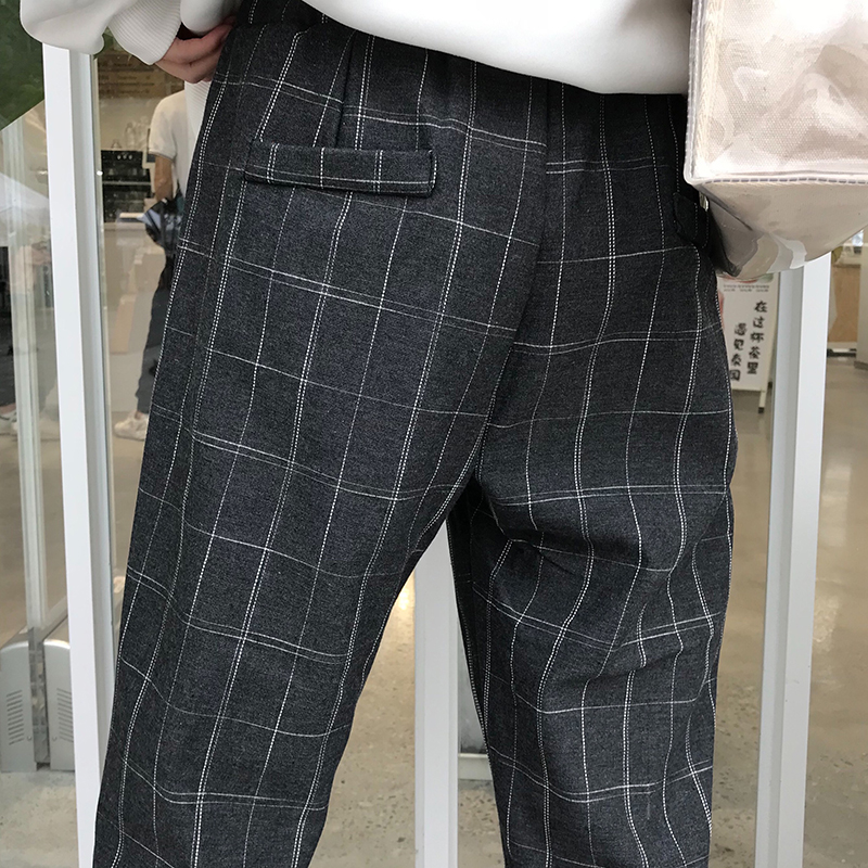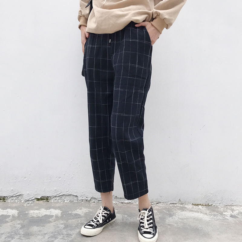 / 復古風格子松緊高腰顯瘦休閑褲秋冬裝新款怪味少女寬松哈倫八分褲