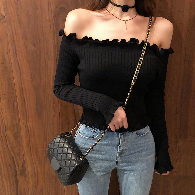 / 2018新款港風秋季韓風一字露肩木耳邊長袖針織衫修身短款打底上衣