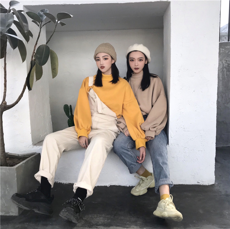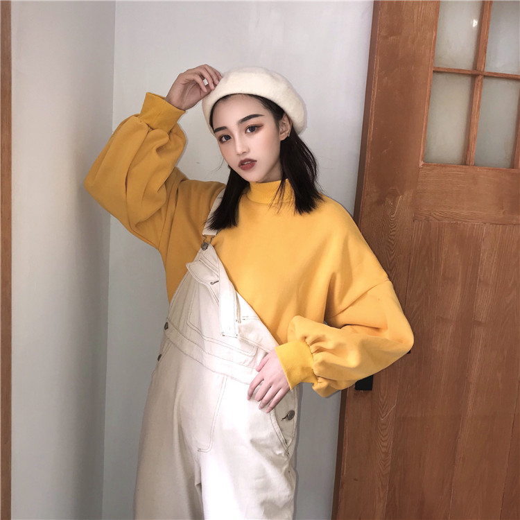 2018新款秋冬女裝韓版寬松半高領燈籠袖加絨加厚套頭衛衣上衣外套
