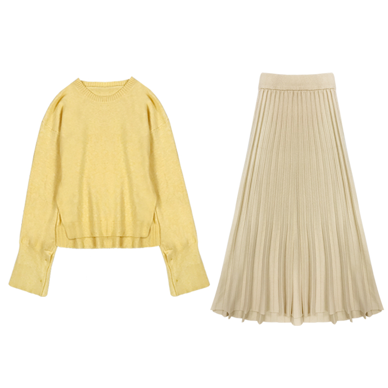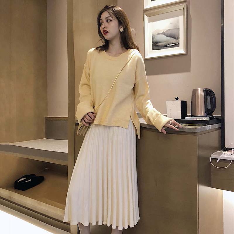 秋冬女裝新款寬松慵懶毛衣針織外套配高腰A字百褶半身裙子兩件套