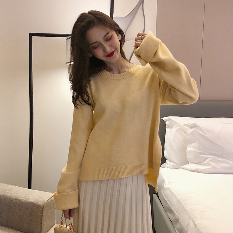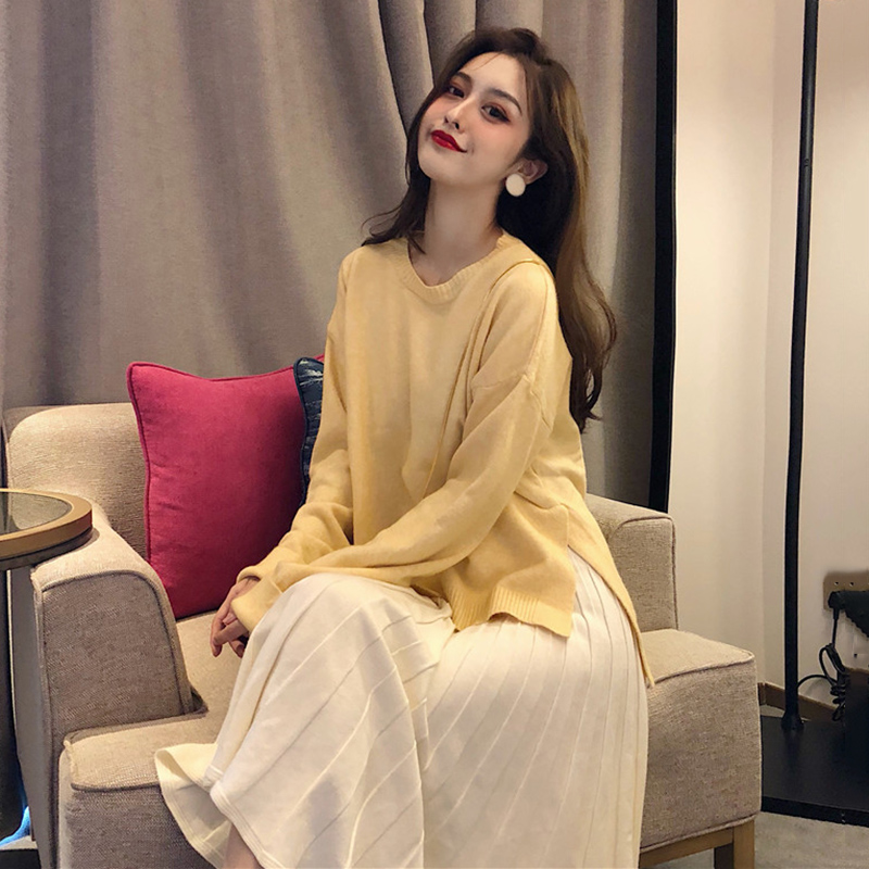 / 秋冬女裝新款寬松慵懶毛衣針織外套配高腰A字百褶半身裙子兩件套