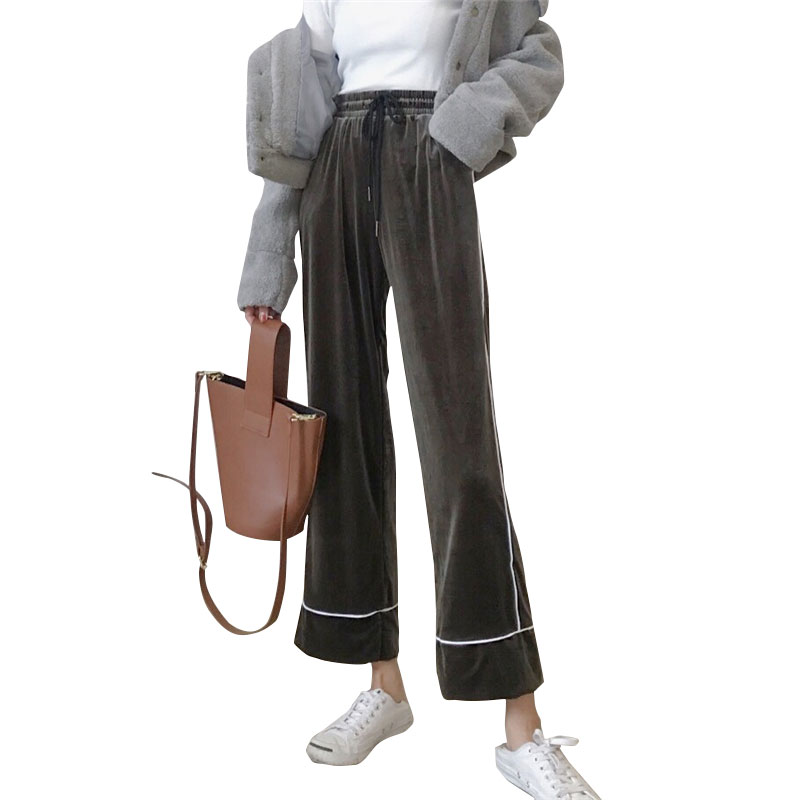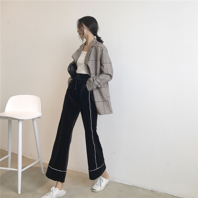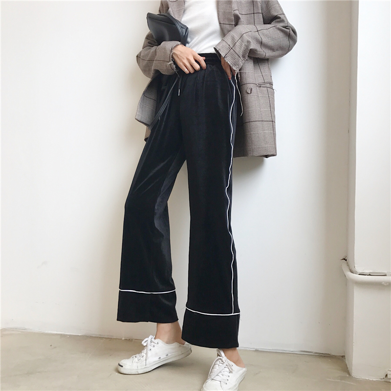 / 秋季chic韓版新潮百搭直筒高腰松緊腰系帶白條絲絨闊腿褲休閑長褲