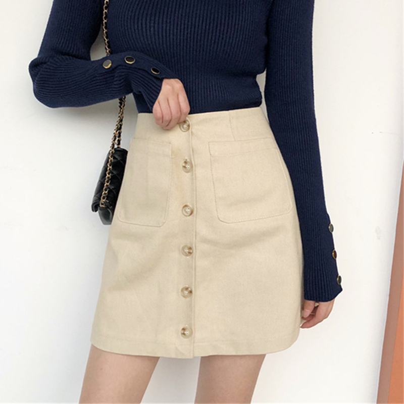 / 短裙女秋冬裝2018新款韓版高腰顯瘦雙口袋鈕扣A字裙包臀半身裙子