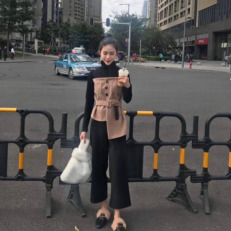 / 百搭高領拼接新款韓版假兩件設計感秋季chic修身不規則上衣配腰帶