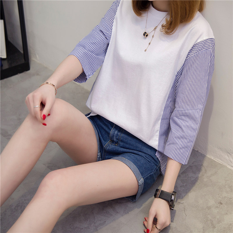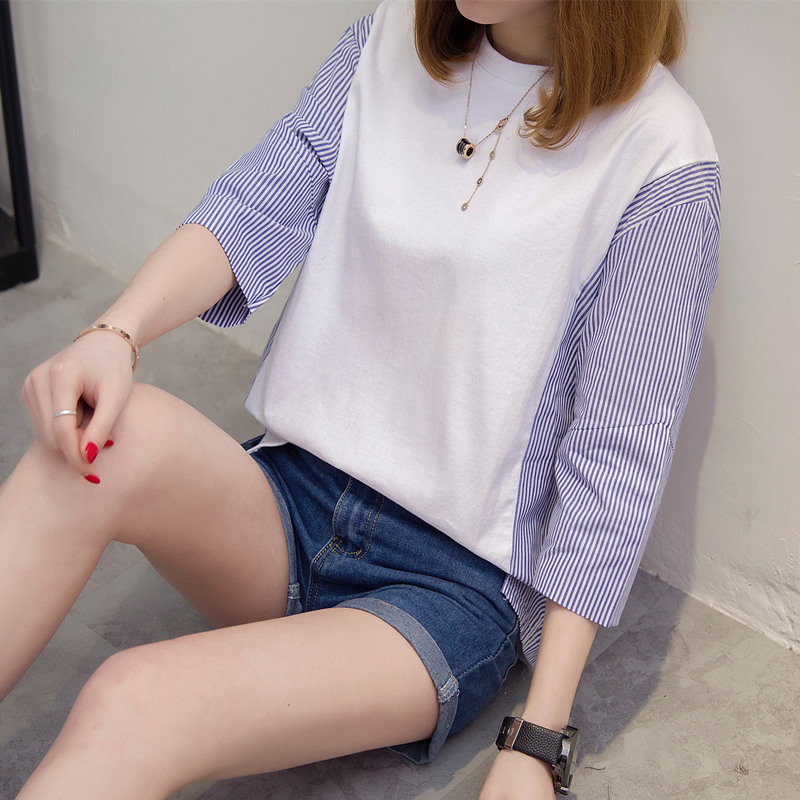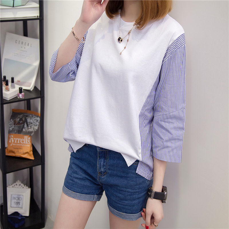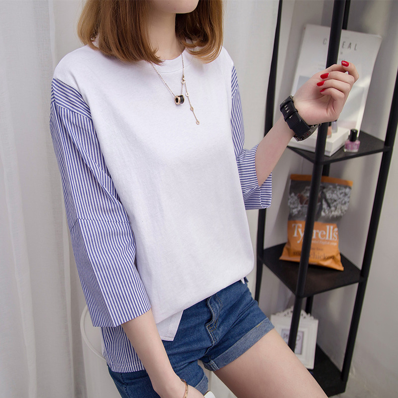 白色t恤女中長袖寬松拼接條紋打底衫短袖體恤女裝夏裝新款潮