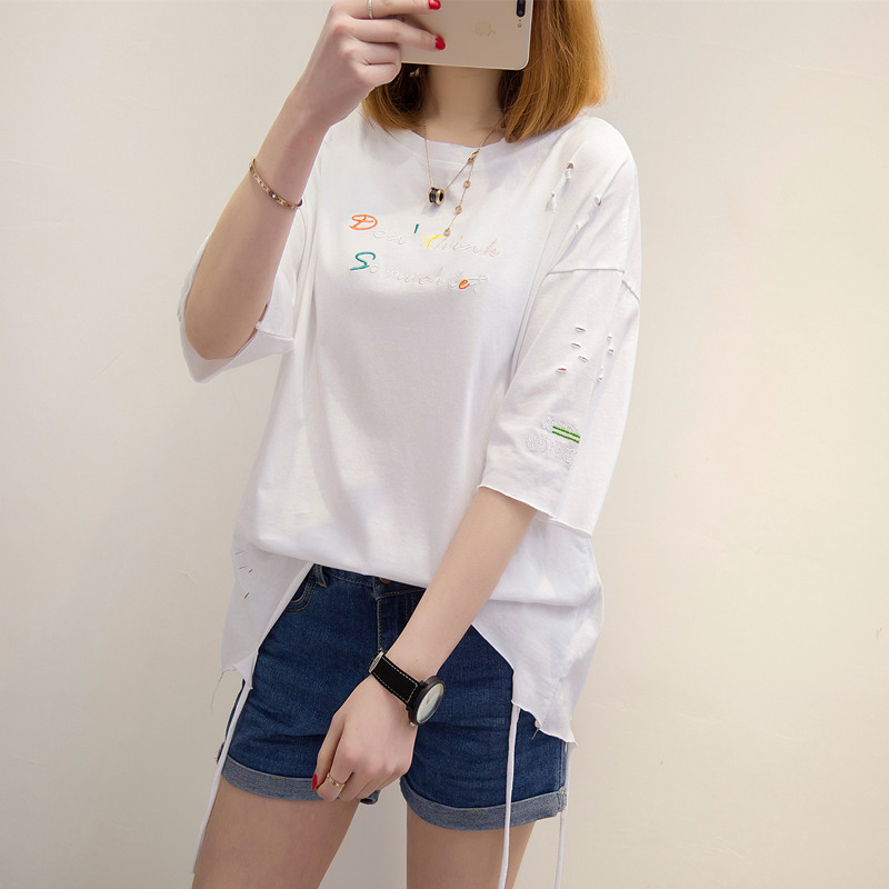 短袖上衣女夏新款寬松白色t恤女流蘇韓版破洞體恤衫打底百搭