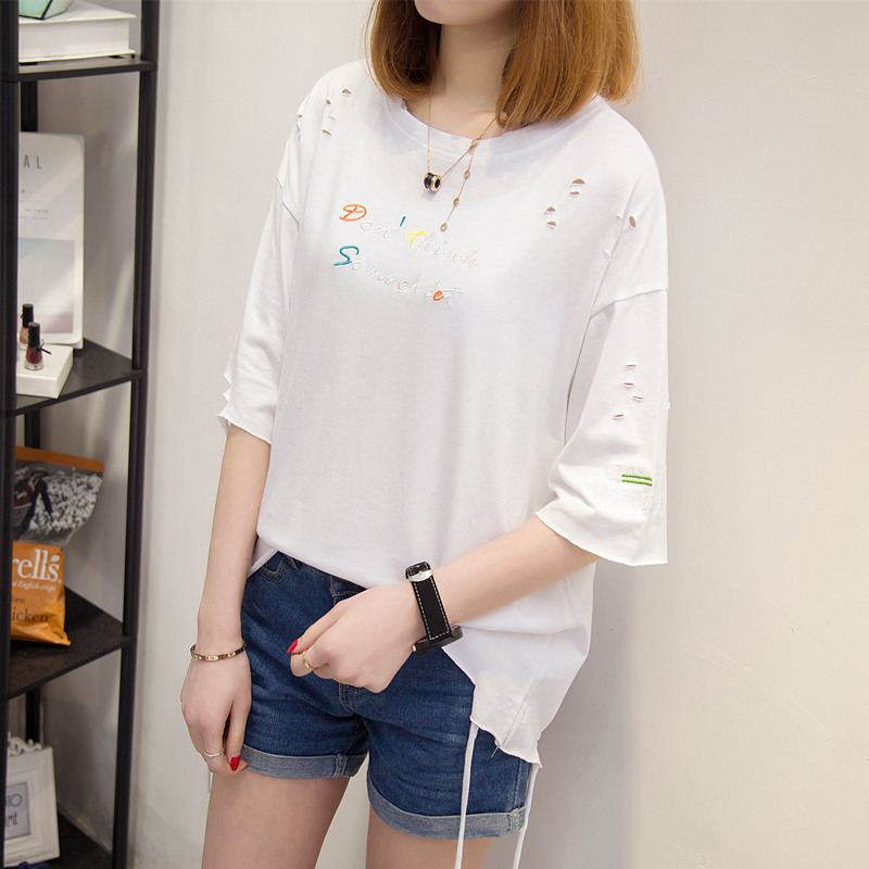 / 短袖上衣女夏新款寬松白色t恤女流蘇韓版破洞體恤衫打底百搭