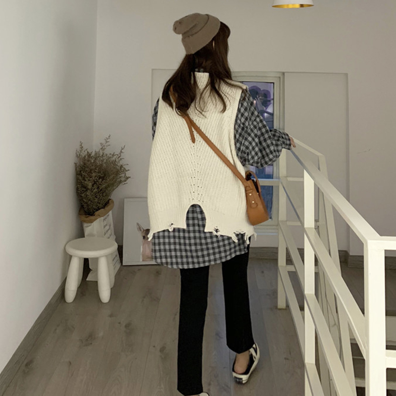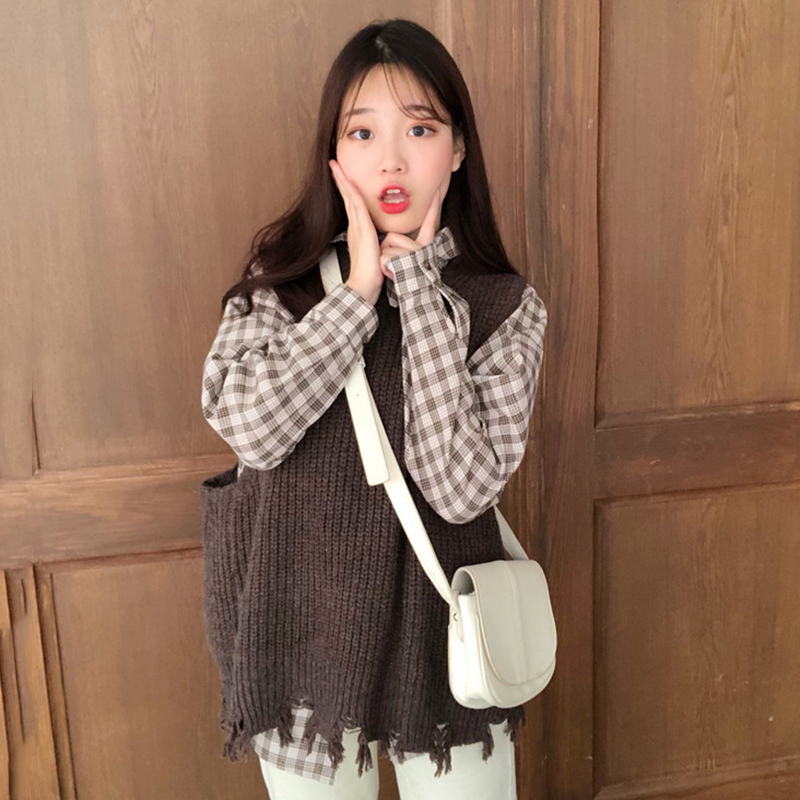 / 休閑套裝秋季女韓版破洞復古毛邊針織馬甲+中長款格子襯衫兩件套