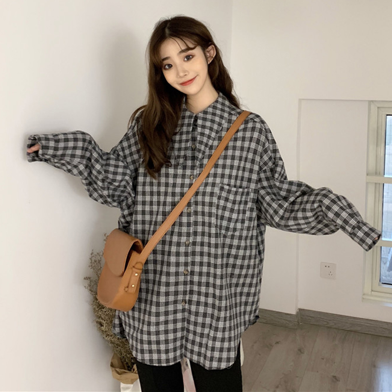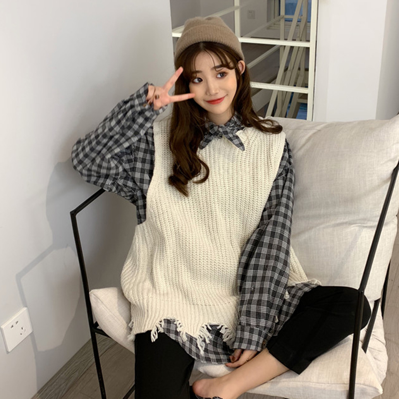 休閑套裝秋季女韓版破洞復古毛邊針織馬甲+中長款格子襯衫兩件套