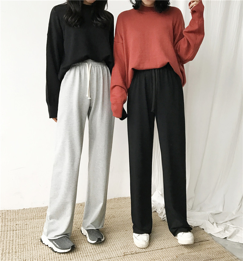 春季新款女裝寬松高腰闊腿褲女顯瘦松緊腰直筒褲百搭學生休閑褲子
