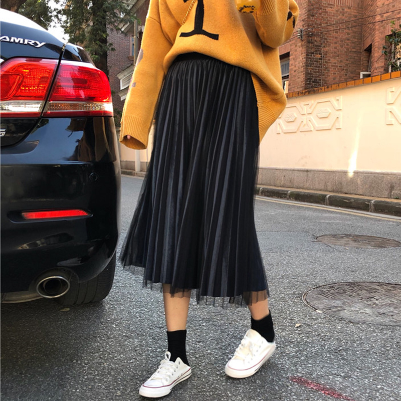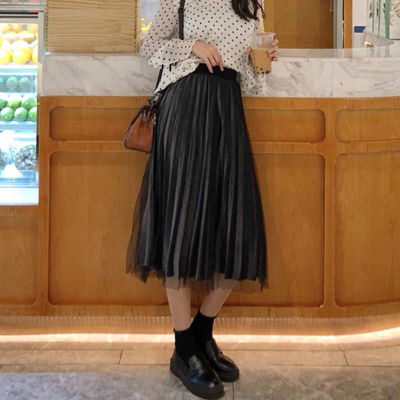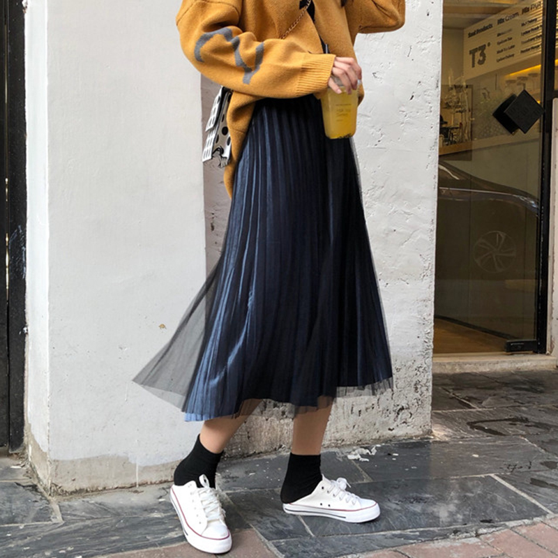/ 時尚漸變色網紗半身裙子女秋冬裝新款學生高腰顯瘦灰色A字中長裙