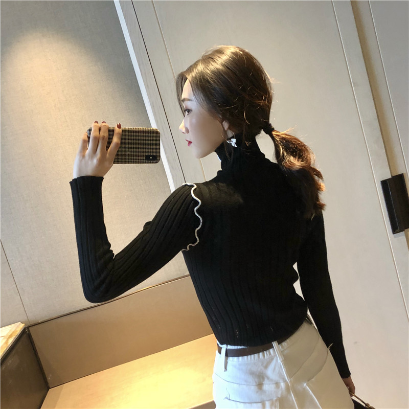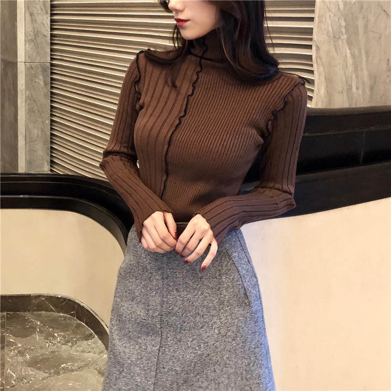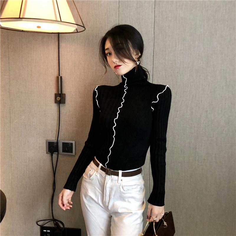 復古韓國chic風木耳邊撞色高領修身顯瘦打底上衣秋冬新款針織衫女
