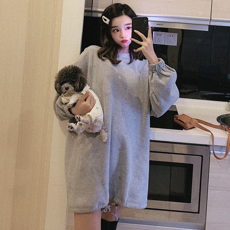 抽繩中長款加絨套頭衛衣2018新款女秋冬裝港風印花外套休閑上衣潮