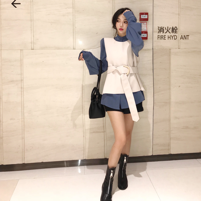 / 秋裝新款韓版時尚套裝女上衣泡泡袖襯衫女裝長袖馬甲兩件套襯衫潮