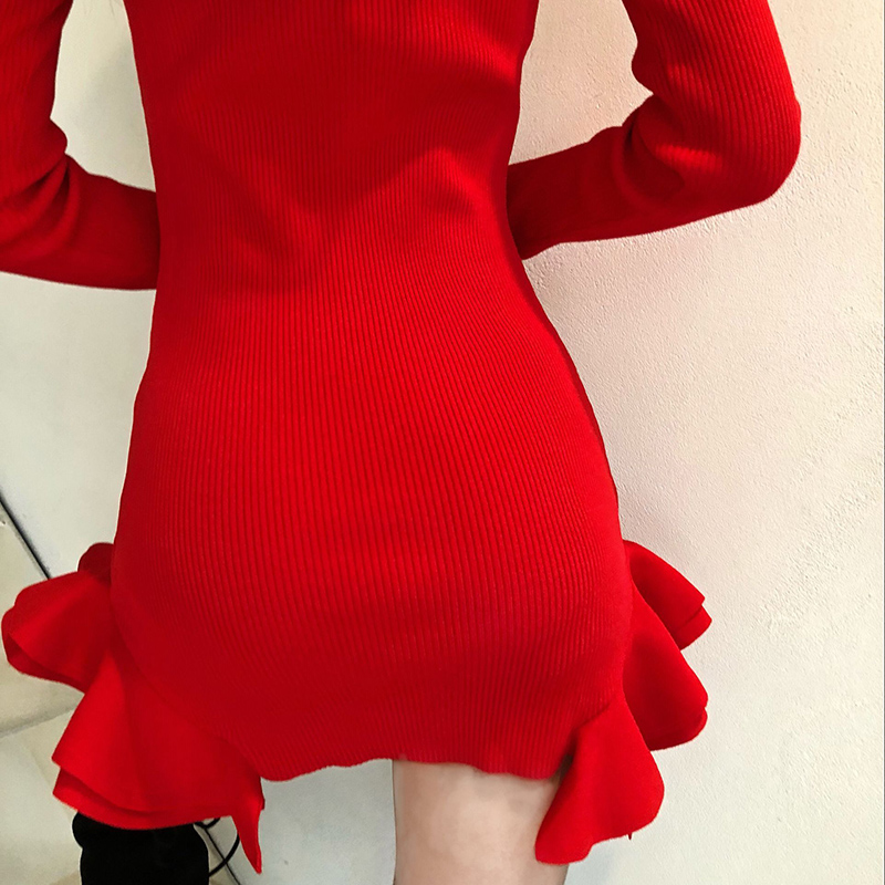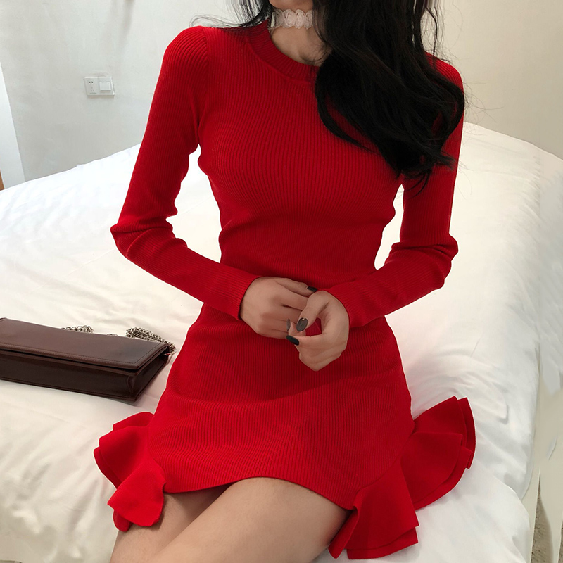 氣質荷葉魚尾裙女韓版修身顯瘦秋裝新款長袖針織連衣裙黑色短裙子