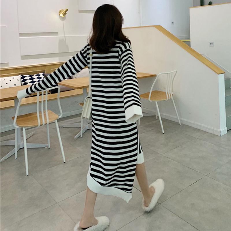 / 氣質復古風不規則條紋長袖針織連衣裙秋冬裝新款法式少女茶歇裙子