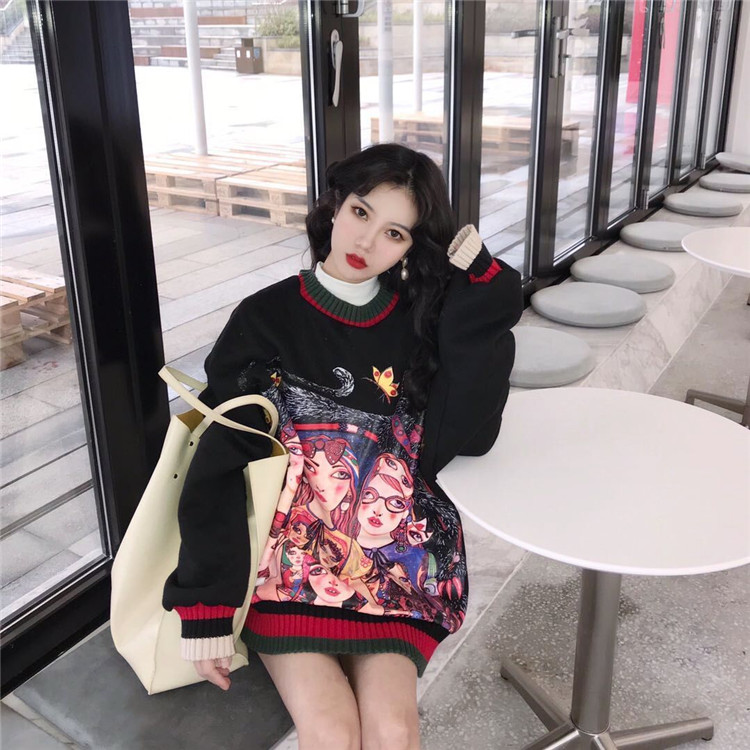 港味個性繪畫印花衛衣女秋2018新款寬松撞色中長款加絨套頭上衣潮