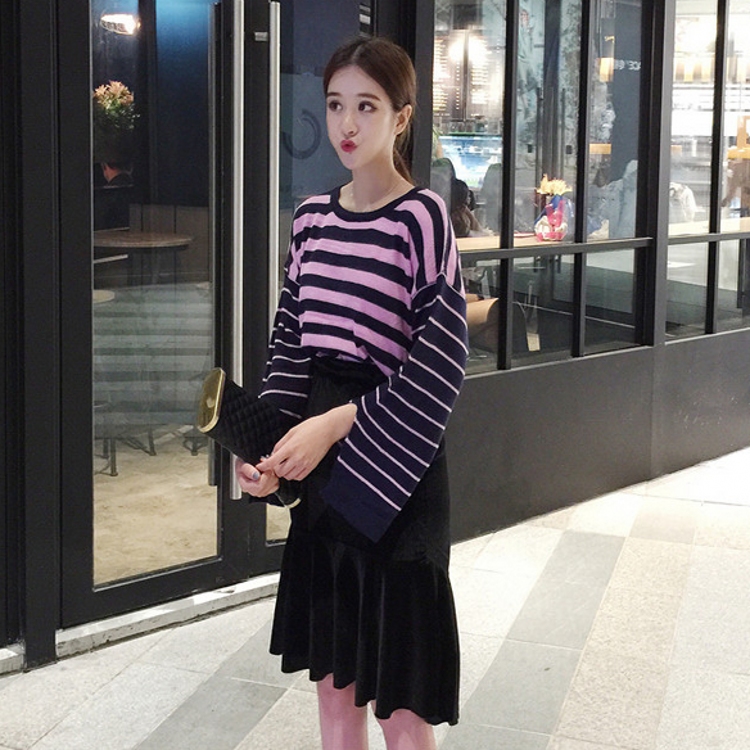 秋冬款韓國開叉袖子套頭條紋毛衣+絲絨魚尾純色半身裙套裝女