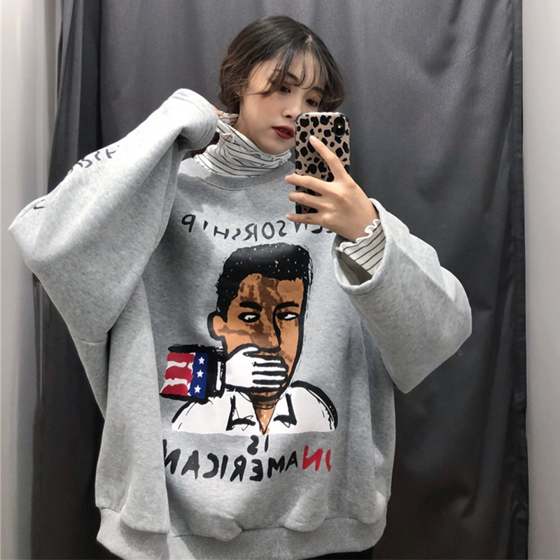 原宿風字母人物印花衛衣女秋冬裝2018新款韓版中長款寬松長袖外套