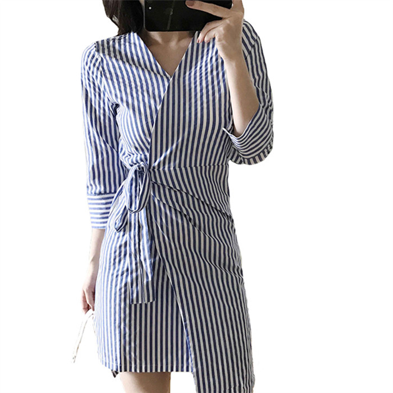 / 春夏女裝新款韓版修身一片式系帶側開叉短裙七分袖條紋包臀連衣裙
