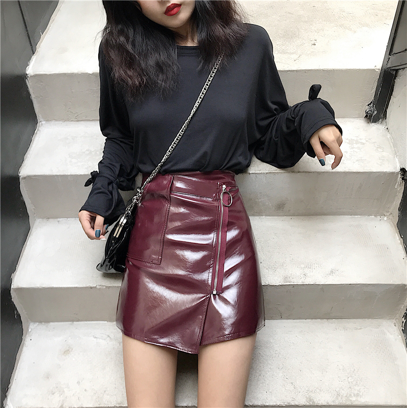 / 港味氣質百搭高腰半身裙女時尚chic不規則a字短皮裙拉鏈亮面裙子