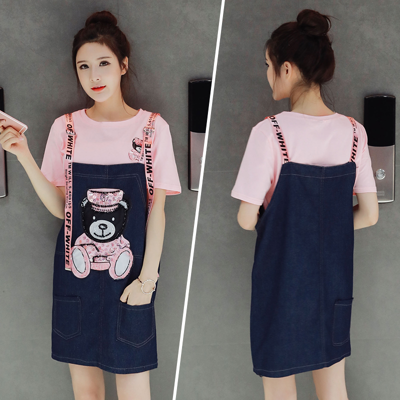 時尚套裝女夏裝新款韓版可愛學生牛仔連衣裙寬松背帶兩件套潮