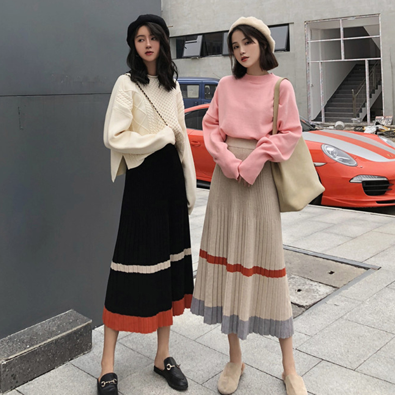 / 秋冬女裝2018新款韓版復古風撞色針織半身裙學生A字百褶中長裙子