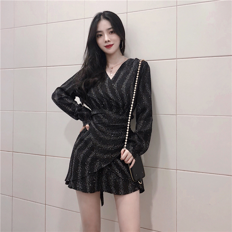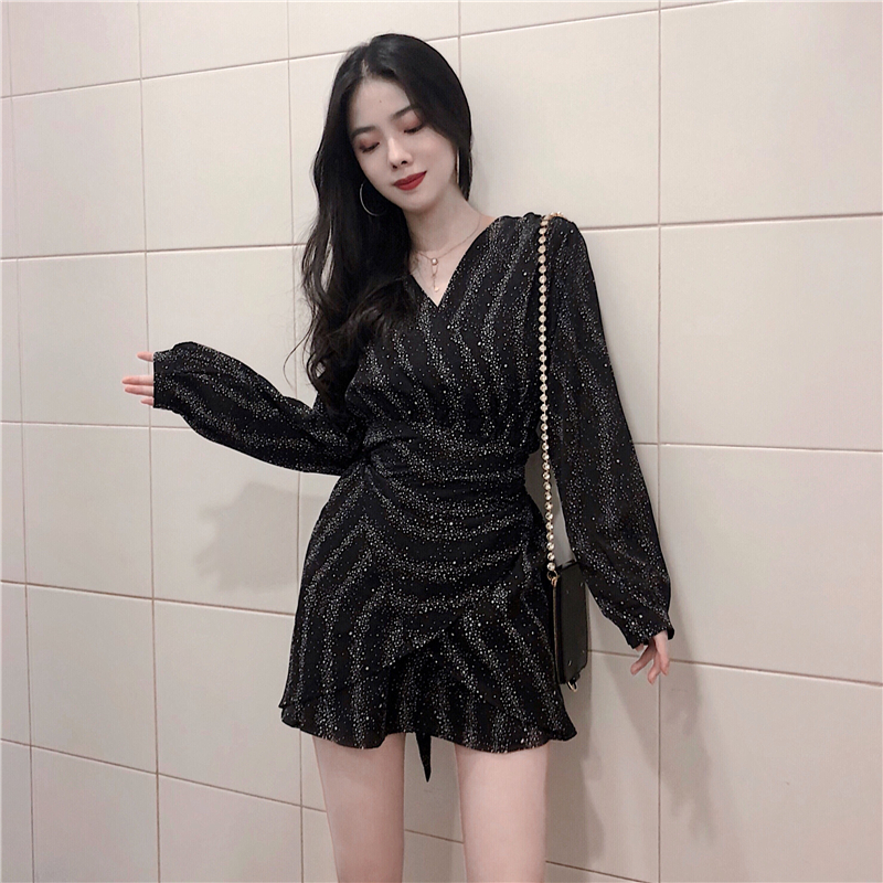 / 秋季新款時尚V領不規則荷葉邊chic綁帶星空連衣裙長袖雪紡打底裙