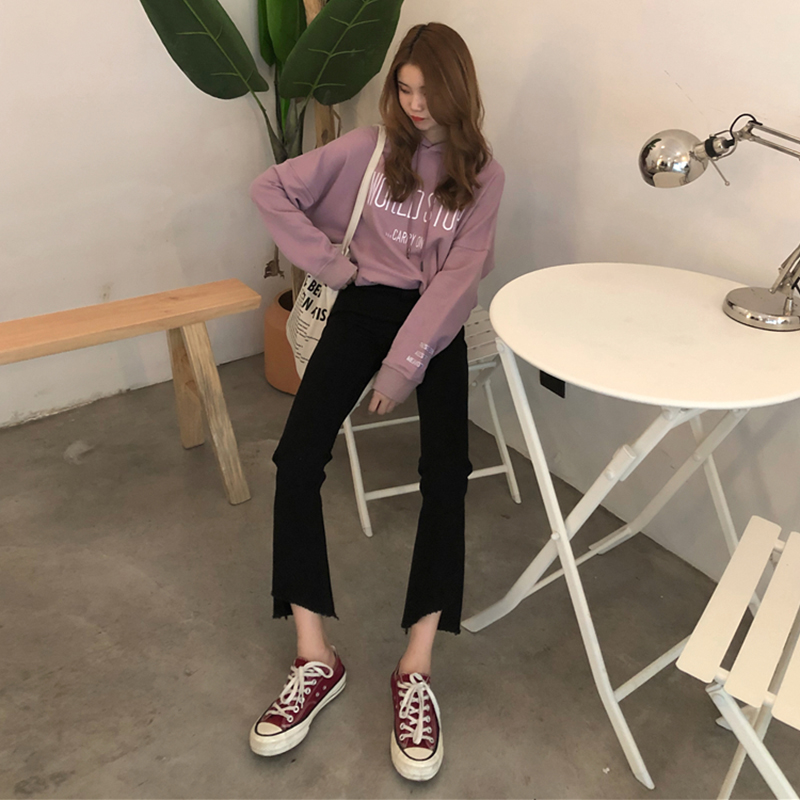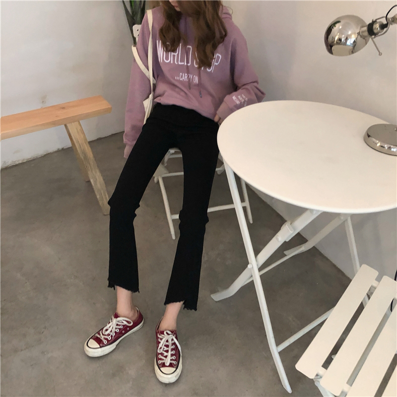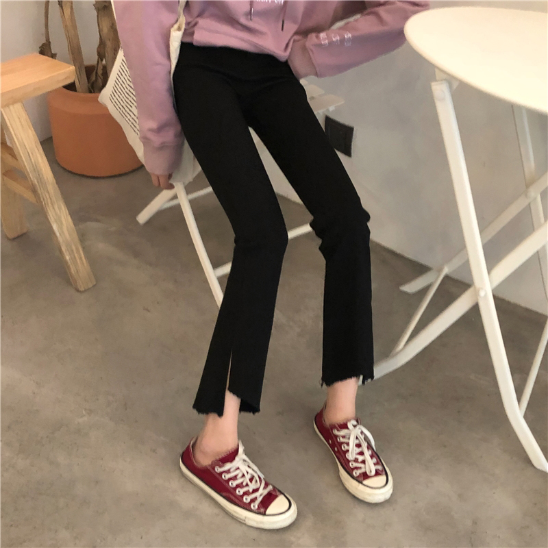 / 黑色高腰九分牛仔褲女秋冬裝2018新款韓版修身顯瘦撕邊開叉喇叭褲
