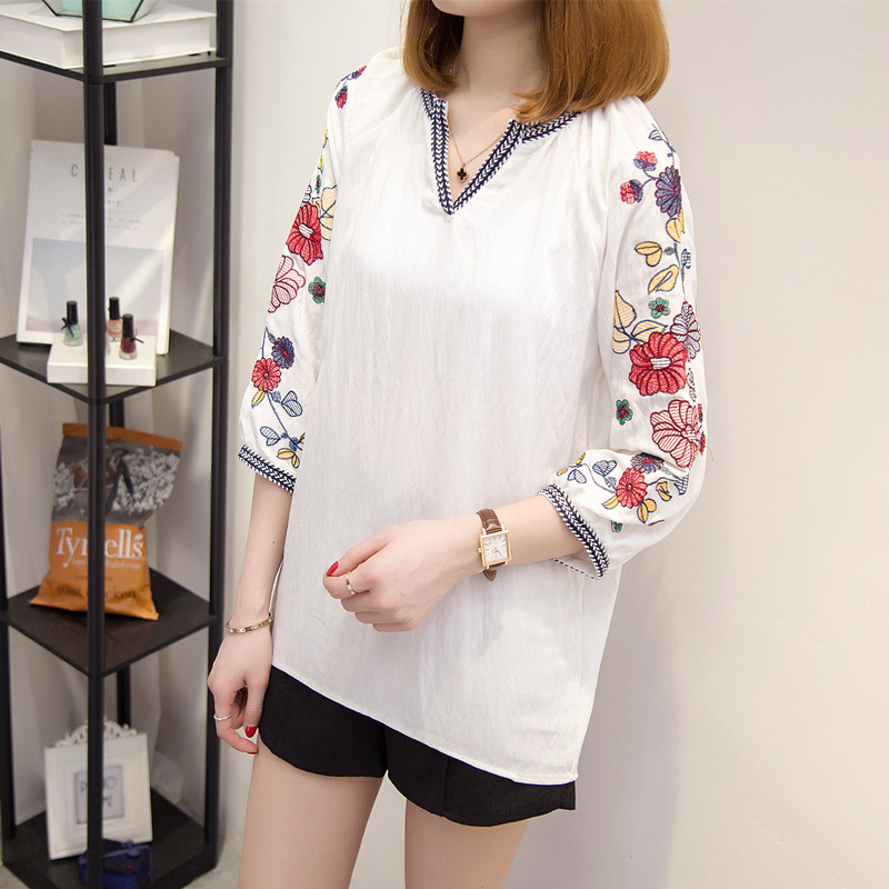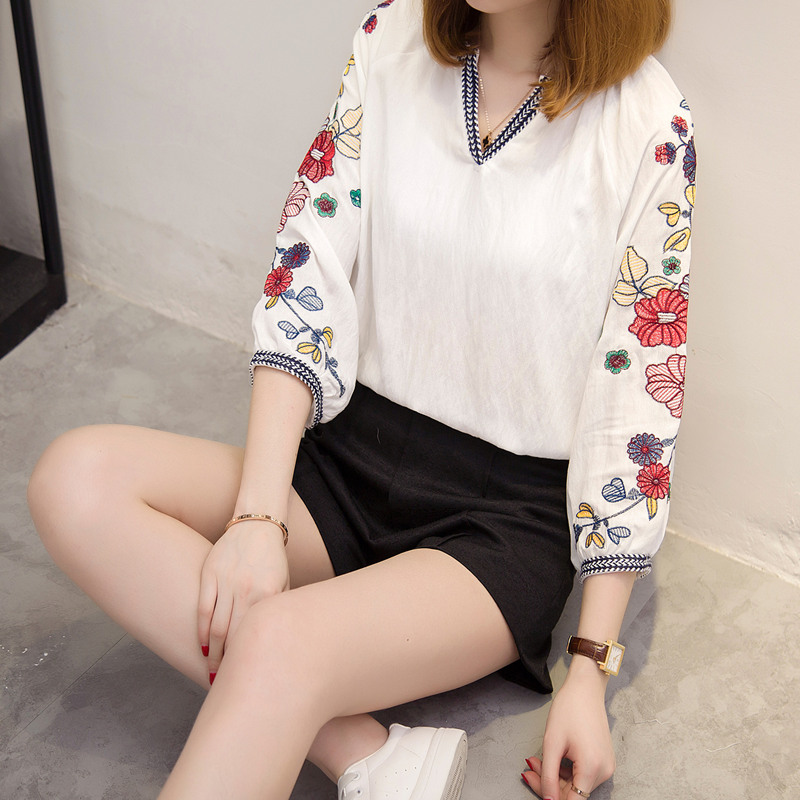 / 春裝新款女裝韓版潮刺繡白色t恤女中長袖寬松花朵打底體恤衫