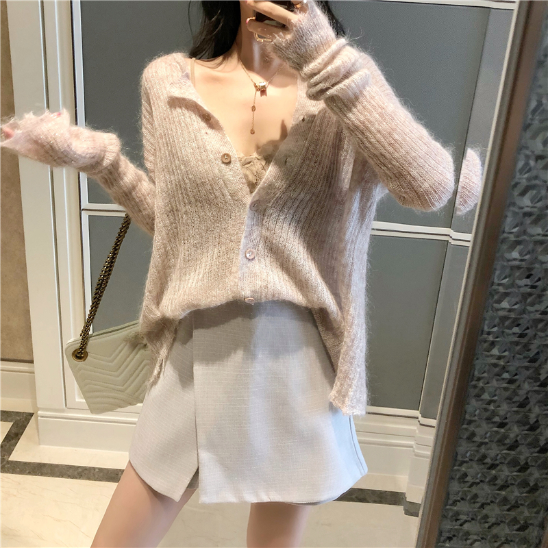 2018秋裝新款時尚套裝百搭毛衣開衫復古蕾絲花邊吊帶港味高腰裙褲