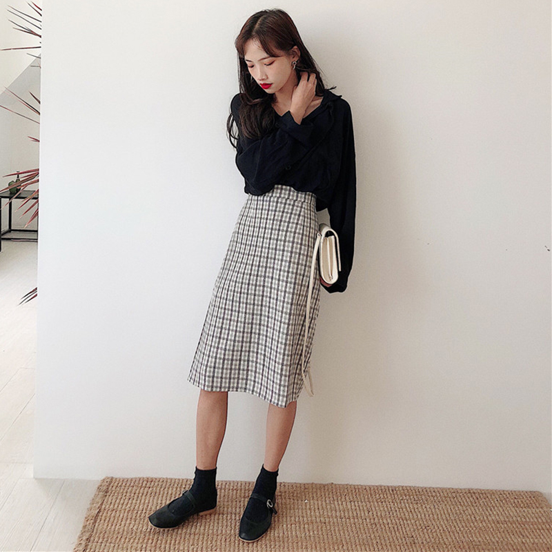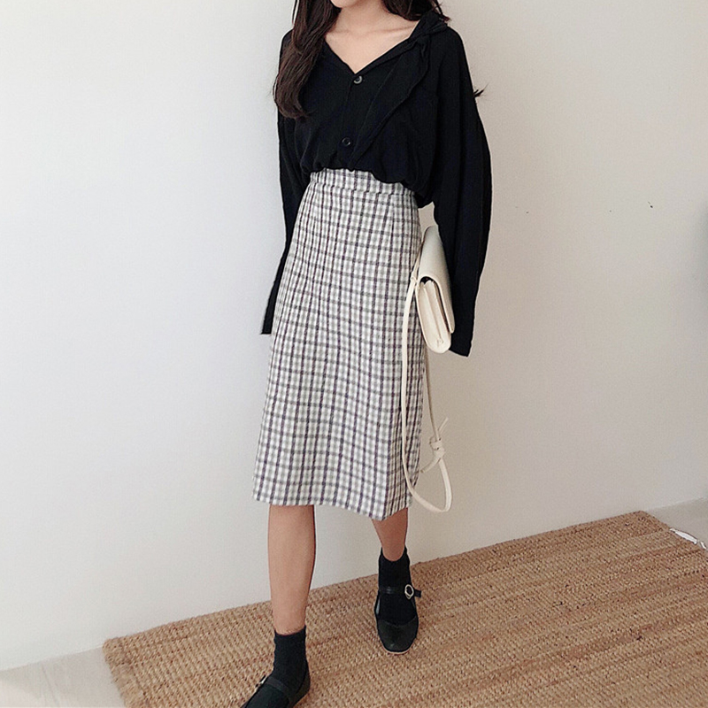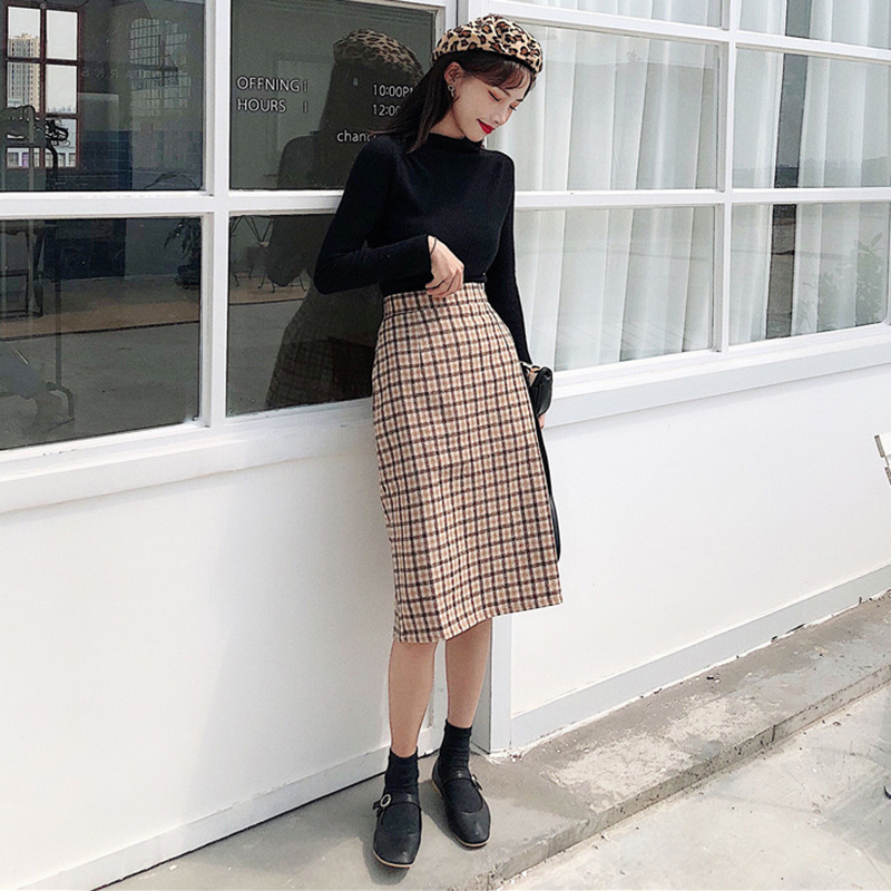 chic毛呢格子半身裙秋冬裝2018新款韓版氣質高腰修身中長款A字裙