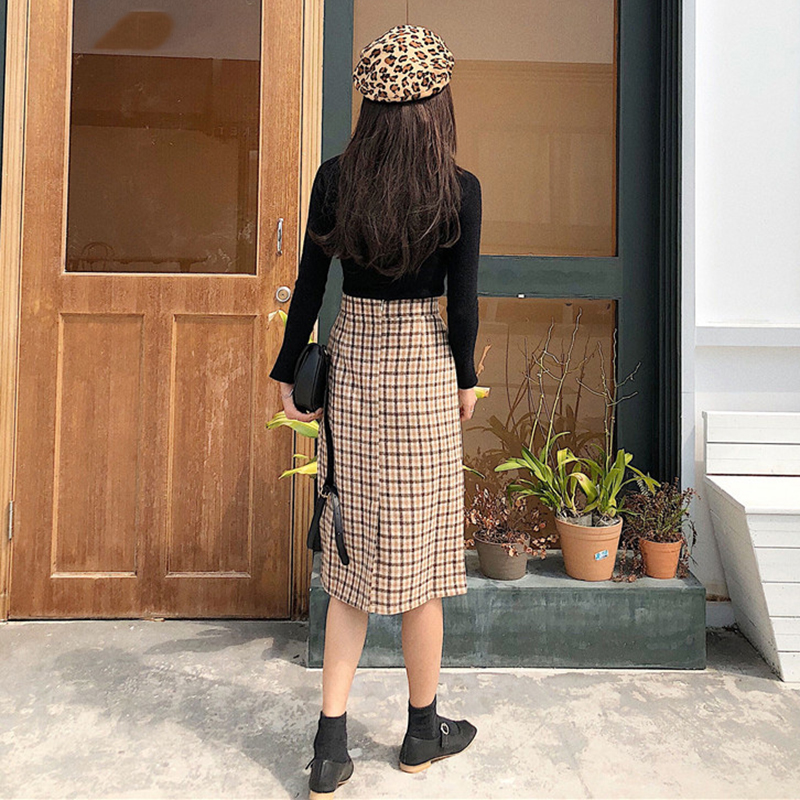 / chic毛呢格子半身裙秋冬裝2018新款韓版氣質高腰修身中長款A字裙