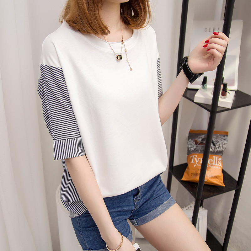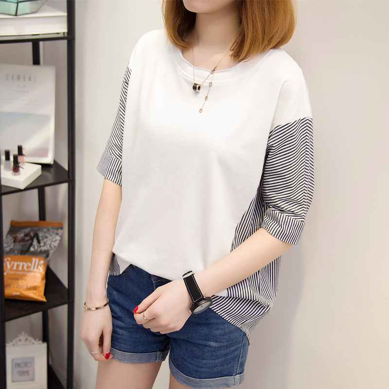 女裝夏裝新款潮白色t恤女中長袖短袖韓版寬松拼接體恤衫百搭