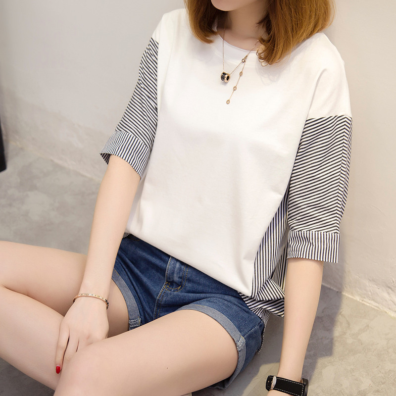 / 女裝夏裝新款潮白色t恤女中長袖短袖韓版寬松拼接體恤衫百搭