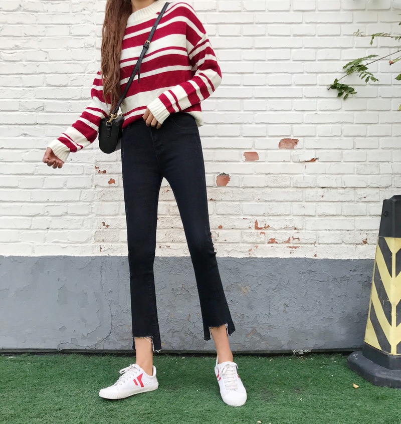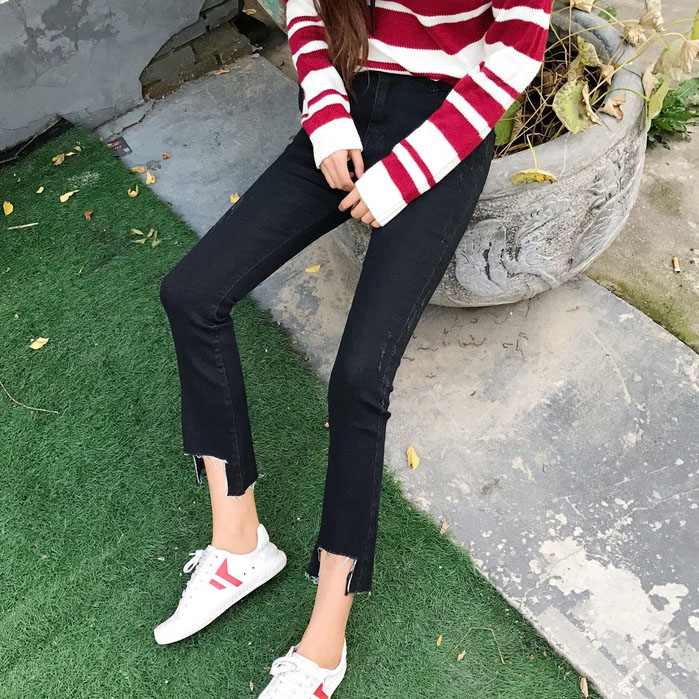 / 韓版港味褲子女秋冬2018新款百搭彈力修身顯瘦褲腳缺口牛仔褲女潮
